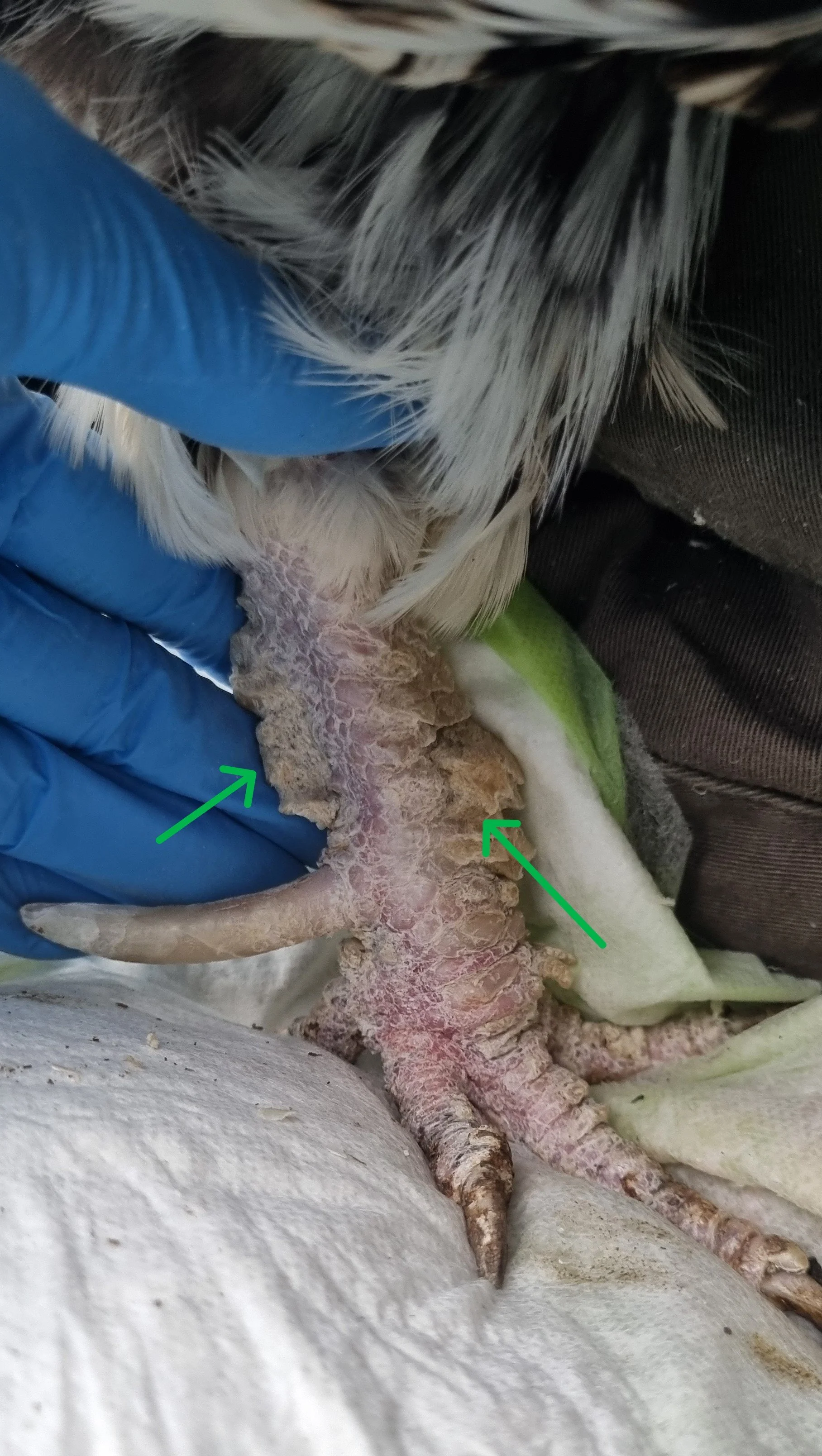 Beep also had his spurs trimmed and was treated for scaly leg mites, including daily foot soaks to soften and remove the hard crust (green arrows), which is very common in scaly leg mite infestations.